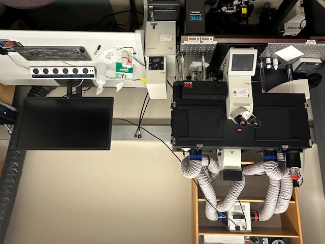 The user interface with the confocal is a multi-knob control panel for some of the more common scanning parameters and a high power workstation running Leica LAS X. There are software modules for setting up multi-channel image acquisitions, FRAP, FRET and 3D Visualization.